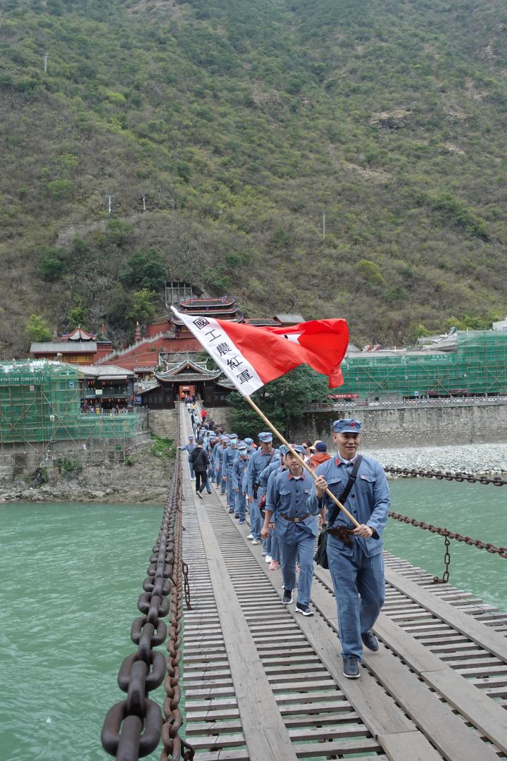 泸定县享有“红色名城”美誉。如今的泸定桥桥面虽已加固加宽,走在上面依然能感受到剧烈晃动,望着桥下湍急的大渡河,全体党员怀着对革命烈士的崇敬之情依次走上铁索桥,感受着当年红军将士们在枪林弹雨中摸爬铁索的勇气和决心。走过红军血染的泸定桥,来到纪念碑广场,面对鲜红的党旗和勇士纪念碑,大家庄严肃立、静默哀思,表达对革命先烈的深切缅怀和无限敬仰。在领誓人杨远波的带领下,全体党员右拳高擎、庄严宣誓,重温入党时的庄严承诺和坚定决心。下午,大家一同走进红军飞夺泸定桥纪念馆,观看了大型实景剧《飞夺泸定桥》,一张张历史图片、一件件文献实物、一段段文字记录以及一场场感人肺腑的实景剧,生动展现了红军将士们不畏艰难困苦、不怕流血牺牲的革命英雄主义精神。活动最后,全体师生在酒店会议室开展研学心得分享,杨远波以《重走红军路 汲取红色力量 传承长征精神》为题交流学习感悟。