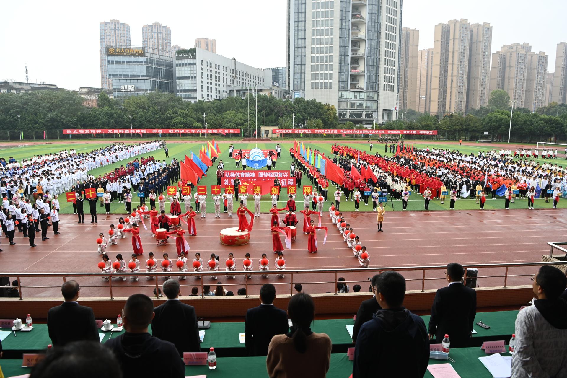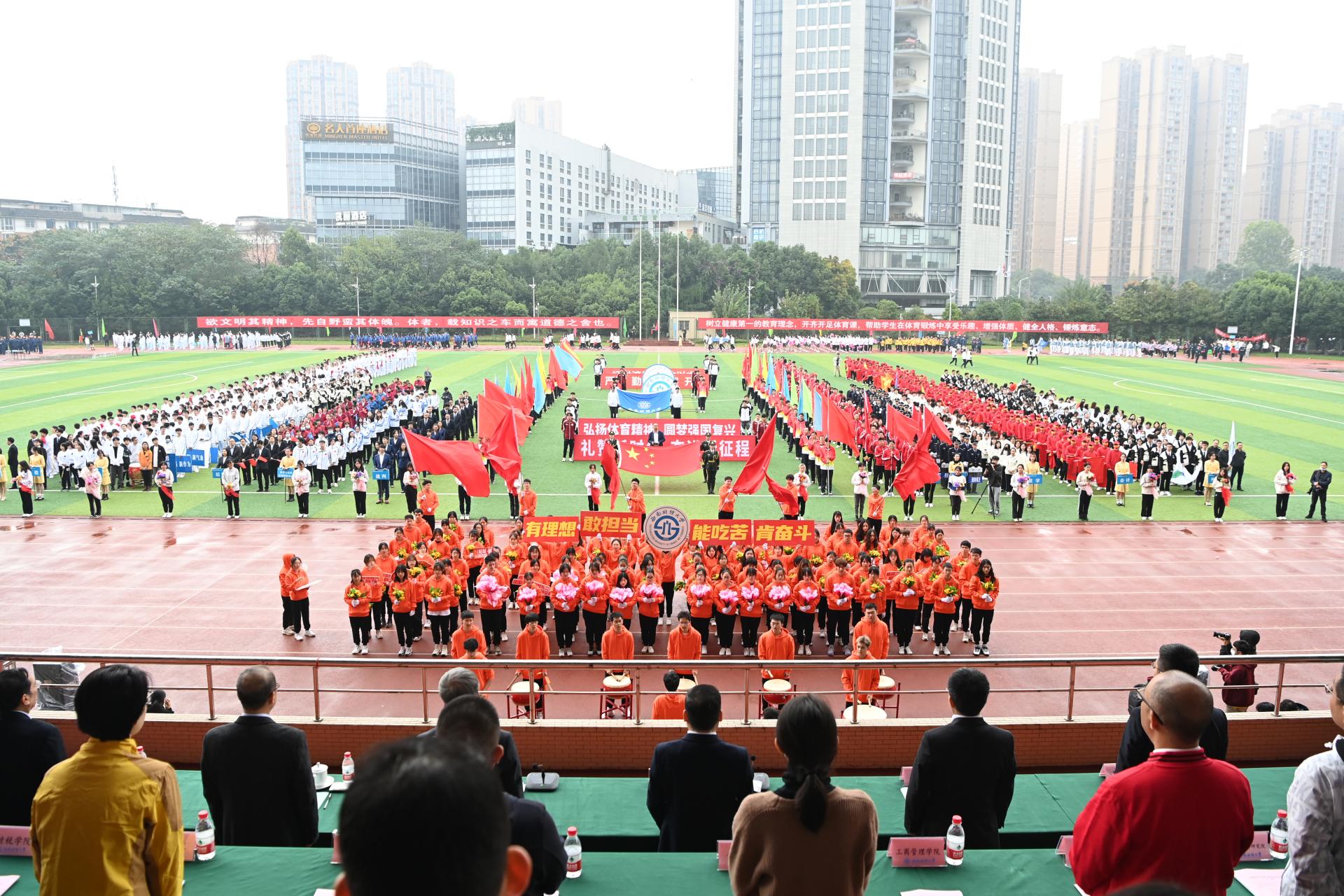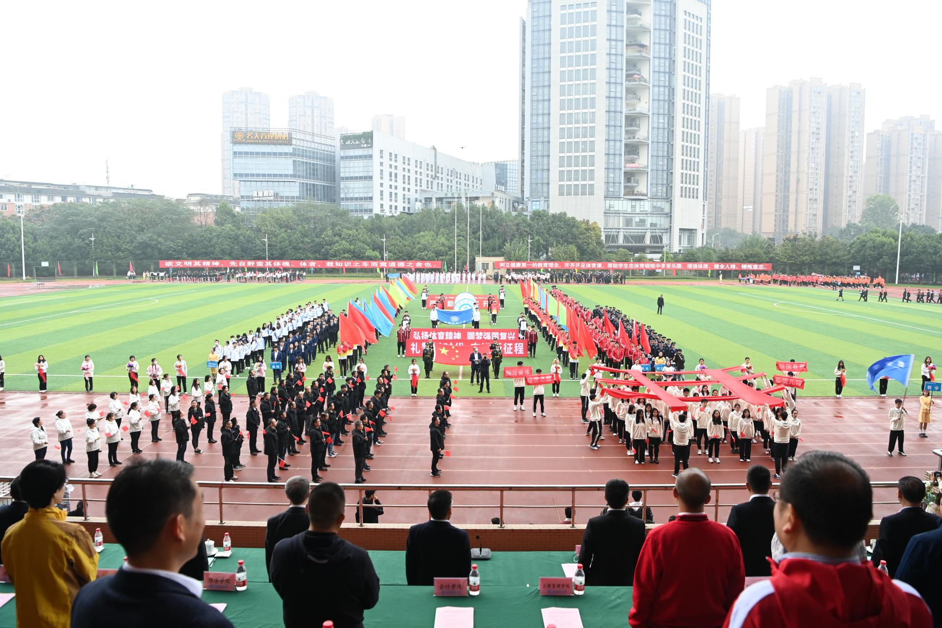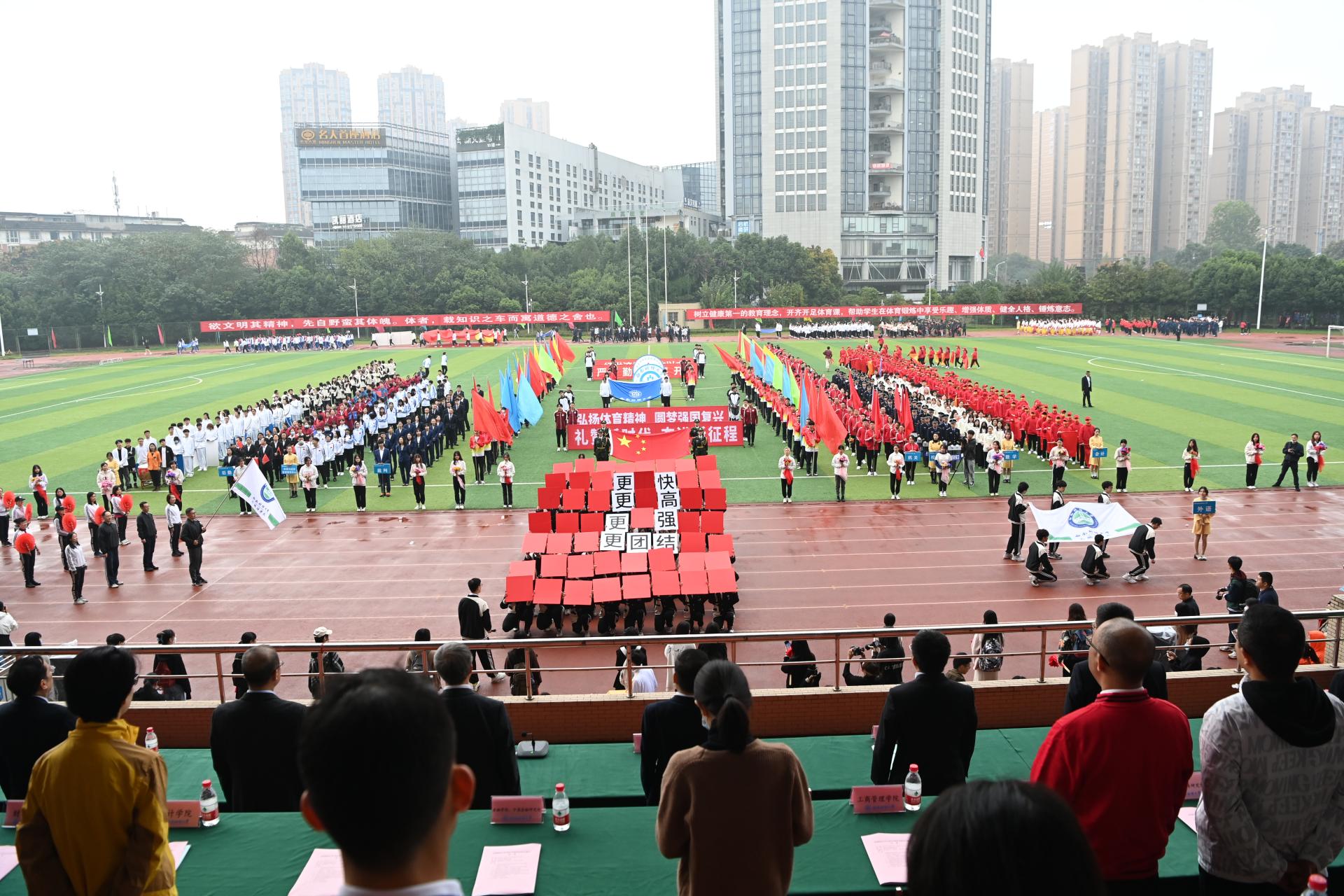 在全国上下深入学习宣传贯彻党的二十大精神之际,我校2022年秋季运动会积极响应习近平总书记在党的二十大报告中发出的“加快建设体育强国”总号召,以“礼赞新时代、奋进新征程,弘扬体育精神、圆梦强国复兴”为主题,于10月27-28日在柳林校区举行。学校党委书记赵德武,党委副书记、校长卓志,党委副书记马骁,党委副书记、副校长李永强,党委常委、副校长尹庆双、史代敏、张邦富、李志生,学院(研究院)和各职能部门负责人参加了开幕式。
