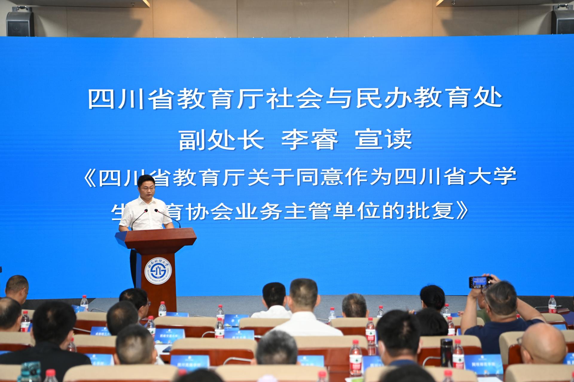 会上,省民政厅、教育厅有关负责人先后宣读了《社会组织名称预登记通知书》《四川省教育厅关于同意作为四川省大学生体育协会业务主管单位的批复》。大会审议了《四川省大学生体育协会章程》,选举产生了协会会长、副会长、秘书长和理事,副秘书长、办事机构设置及各机构主要负责人,并由四川省教育厅领导宣读了结果。