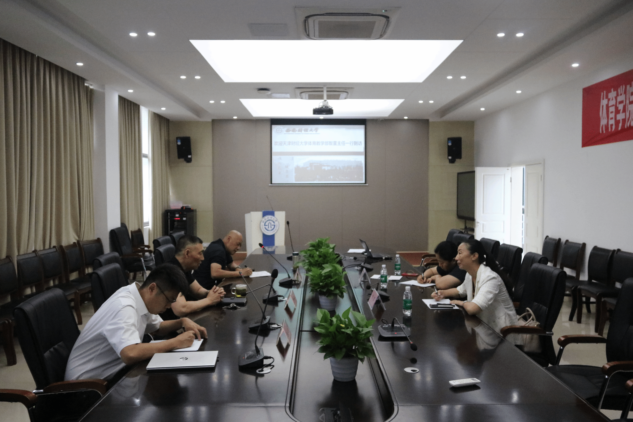 5月24日上午,天津财经大学体育教学部主任智萱、办公室副主任储信蕊一行到我院进行交流座谈。yl12311线路检测院长杨远波,副院长阴涛、陈丛刊参加座谈会。