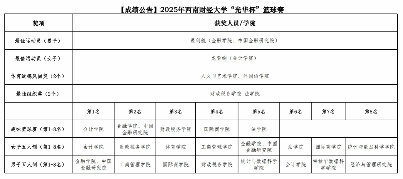 本届“光华杯”篮球赛设置了男女“五人制篮球”和“趣味篮球”两项比赛,共吸引了来自18个学院的学生、校友、教工,总计31支队伍参加。赛事举办期间,各学院积极备战、奋力拼搏,经过9天紧张而激烈的比赛,队员们在球场上挥洒汗水,激扬青春,增进了交流,促进了友谊,赛出了风格,赛出了水平,有效提高了我校篮球竞技水平。通过这次比赛,充分发挥了体育的育人功能,展示了新时代大学生的蓬勃朝气和勇于拼搏的优良品质,努力成为堪当民族复兴重任的时代新人,在新时代奋进新征程中,砥砺奋发,以昂扬的精神风貌迎接百年校庆的到来!同庆百年,共襄盛典!