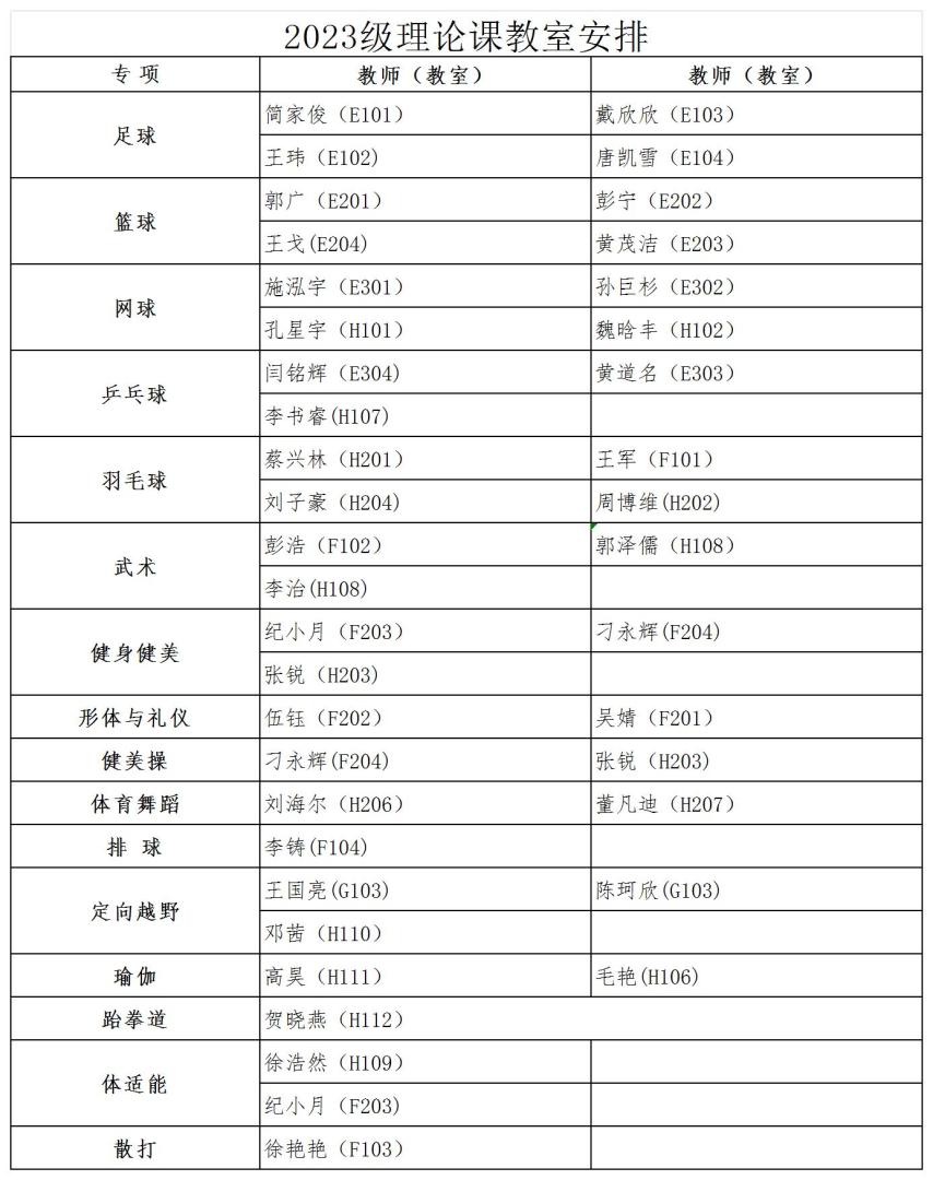 经教务处同意,本学期2023级本科生第3周体育课为体育教学理论课,10月7日起恢复户外教学。根据教室资源状况,现将理论课具体安排通知如下: