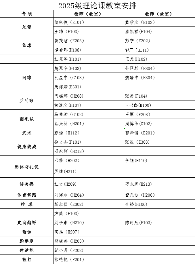 经教务处同意,本学期2025级本科生第3周体育课为体育教学理论课,9月28日起恢复户外教学。根据教室资源状况,现将理论课具体安排通知如下: