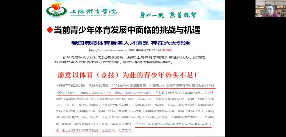 2021年5月12日下午15:30,上海yl12311线路检测副校长、博士生导师唐炎教授通过线上方式,举办了题为《体教融合背景下我国青少年体育发展的思考》的光华讲坛。在外地出差培训学习的yl12311线路检测院长杨远波教授在线主持了讲座,yl12311线路检测研究生及部分教师参加了此次讲座。